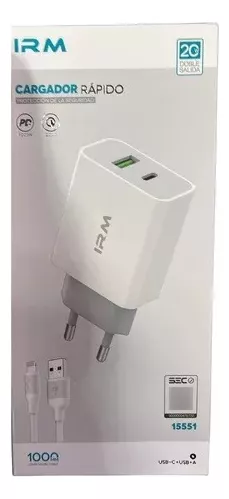 CARGADOR CERTIFICADO CARGA RÁPIDA DOBLE SALIDA IRM2.4A DOBLE USB + CABLE LIGHTNING MODELO 15551 Adaptador de corriente de 2.4A carga rápida con dos: puertos Usb y UsbC , te permite cargar dos dispositivos al mismo tiempo donde quiera que estés